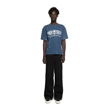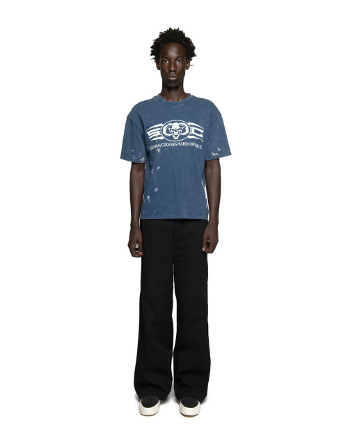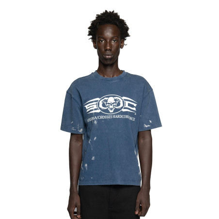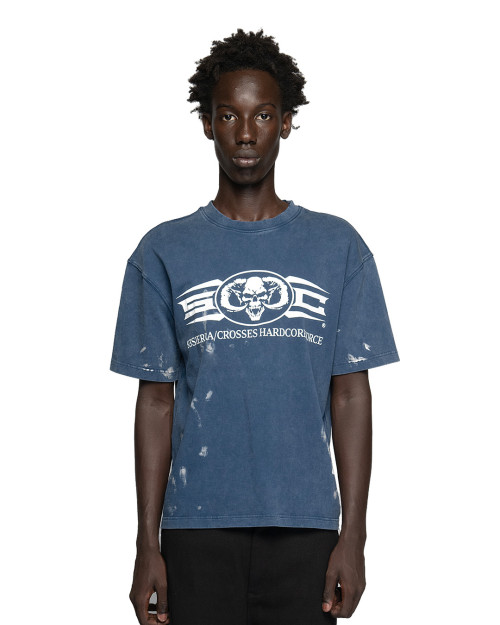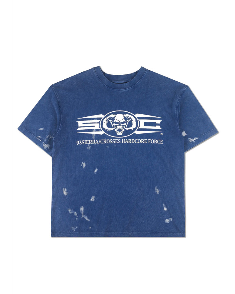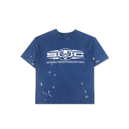 The Hardcore Force T-Shirt by 93 SIERRA/CROSSES encapsulates the bold aesthetic of urban graphic design: a navy blue T-shirt with a splattered effect and a striking front print that combines logo and typography with attitude.